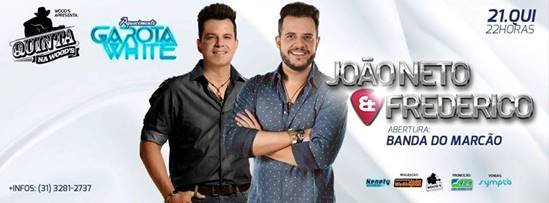 Aquecimento Garota White – Primeira edição da Quinta na Wood’s apresenta João Neto e Frederico Felipe de Jesus 19 de julho de 2016 Cultura, Notícias 71 Fruto da parceria entre a Wood’s, Nenety Eventos e João Wellington Promoções, projeto inédito estreia no dia 21 de julho; evento será o aquecimento oficial para o Garota White, que já tem 96% dos ingressos vendidos Referência em festas e baladas sertanejas na região metropolitana de Belo Horizonte, a Wood’s (Alameda da Serra, 154 – Vale do Sereno) será palco para um projeto inédito. A partir do dia 21 de julho, as noites de quinta-feira serão mais uma opção para curtir o melhor da música sertaneja. Na estreia do Quinta na Wood’s, a Wood’s, a Nenety Eventos e o empresário João Wellington promovem o show da dupla João Neto e Frederico. Ainda se apresentam a Banda do Marcão e o DJ Heldo, que aquecerão o público para o Garota White. De acordo com o empresário Cristiano Carneiro, da Nenety Eventos, o objetivo do projeto é trazer artistas de renome nacional para um público que não tinha boas opções de baladas sertanejas às quintas-feiras. “Estou feliz e empolgado com esta nova iniciativa, que é inédita em todo o país, pois a Wood’s em Belo Horizonte é a única que vai abrir nas quintas-feiras, já que no resto do Brasil a tradição é a quarta-feira. Ou seja, a partir de agora BH e região passam a contar com uma grande oportunidade de curtir uma festa com qualidade e grandes nomes da música”, explica o empresário. Para o empresário João Wellington, esta é mais uma oportunidade para o público curtir a noite em um local agradável e com atrações de renome nacional. “Escolhemos João Neto e Frederico para iniciar o projeto e a intenção é a cada semana trazer um nome diferente, que esteja em ascensão e que com certeza faça o público se divertir e dançar na Wood’s”, conta. João Neto e Frederico Representantes da música sertaneja universitária, João Neto & Frederico gravaram seu primeiro CD, intitulado Se Não For por Amor, em 2004. O álbum Modão – Ao Vivo, lançado em 2006, foi o precursor do grande sucesso Acústico Ao Vivo, CD e DVD produzido em 2007, que revelou a dupla para todo país. O trabalho João Neto & Frederico – Ao Vivo, lançado em 2008, foi um marco na carreira dos músicos. “Essa gravação foi especial, vai ficar em nossa lembrança para sempre. O show contou com 30 mil pessoas e estava chovendo, mas o público estava animado cantando as músicas com a gente, foi algo realmente contagiante”, lembra João Neto. No ano seguinte, a canção da dupla “Detonou”, fez parte da trilha sonora da novela Paraíso, da Rede Globo. Em 2009, lançaram pela Som Livre, o álbum Vale a Pena Sonhar. Neste trabalho, que contou com 23 músicas, introduziram novos ritmos ao sertanejo, como no arrocha “Não Vou Mais Chorar” e na canção “Marmiteiro”. Outros destaques foram “Revelação” e “Sai Pra Lá”. Em 2012, apostando em um repertório mais dançante, lançaram o álbum Ao Vivo em Palmas, pela Som Livre, gravado na capital tocantinense. O disco consagrou as músicas “Tô Morando Sozinho”, “Tá Combinado” e “Lê Lê Lê”, tendo as duas últimas figurado entre as cinco mais executadas do país. A canção “Lê Lê Lê” fez parte da trilha sonora da novela Cheias de Charme da Rede Globo. Com essa música, a dupla conseguiu alavancar sua carreira, fazendo shows em diversas cidades no Brasil e no mundo, contando agora com 22 shows por mês. No último ano, lançaram o clipe da música “Presto Pouco”, dos compositores Gabriel Agra, Juliano Tchula e Marília Mendonça. A música é sucesso em todas as rádios do Brasil, atingindo a marca de mais de 6 milhões de views no Youtube e aumentando cada dia. Garota White O Garota White será realizado no dia 23 de julho, a partir das 22h, no Expominas, com shows de Wesley Safadão e Gabriel Diniz. Até a manhã de segunda-feira, mais de 96% dos ingressos foram vendidos. Serviço: Quinta na Wood’s – Aquecimento Garota White Atrações: João Neto e Frederico, Banda do Marcão e DJ Heldo Local: Wood’s – Alameda da Serra, 154 – Vale do Sereno Data: 21 de julho, quinta-feira Horário: 22h Ingressos: Sem nome na lista: Espaço Bud: Masculino R$ 60 | Feminino R$ 40 Mezanino: Masculino R$ 70 | Feminino R$ 50 Com nome na lista ou antecipado Espaço Bud: Masculino R$ 50 | Feminino R$ 30 Mezanino: Masculino R$ 60 | Feminino R$ 40 Mesas para 4 pessoas Espaço Bud: R$ 300 Mezanino: R$ 350 Lounges para 12 pessoas R$ 1200 Vendas: Nenety Eventos www.nenety.com.br ou Shopping 5ª Avenida (Rua Alagoas, 1314, 16C, Savassi) Sympla www.sympla.com.br Wood’s Classificação indicativa: 18 anos Mais informações: //www.woodsbar.com.br/belohorizonte (31) 3567-9589 Realização: Wood’s, Nenety Eventos e Empresário João Wellington Promoção: Rádio Liberdade FM comentários