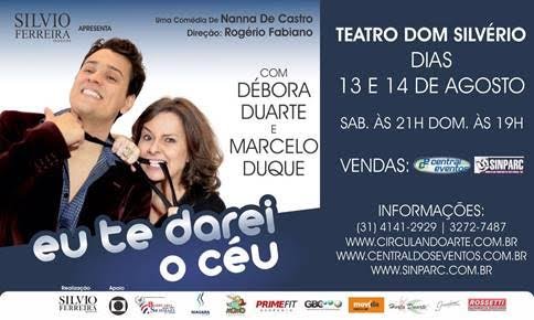 Débora Duarte e Marcelo Duque chegam a Belo Horizonte com o espetáculo “Eu Te Darei o Céu” Felipe de Jesus 3 de agosto de 2016 Cultura, Notícias 86 Peça fica em cartaz nos dias 13 e 14 de agosto no Teatro Dom Silvério A Silvio Ferreira Produções traz à capital mineira a estreia nacional do espetáculo “Eu Te Darei o Céu”. Estrelado pelos atores Débora Duarte e Marcelo Duque, a montagem fica em cartaz nos dias 13 e 14 de agosto, sábado às 21h e domingo às 19h, no Teatro Dom Silvério (Av. Nossa Senhora do Carmo, 230, Savassi). Esta comédia romântica conta a história de Thaís, uma publicitária, que no seu aniversário de sessenta anos recebe de presente das amigas um garoto de programa, Cláudio. Os dois passam uma noite juntos e este encontro acaba se tornando surpreendentemente rico e humano por conta de uma situação embaraçosa: eles ficam presos um ao outro por uma algema da qual não têm a chave. O texto de Nana Castro foi inspirado em uma história real e sua adaptação para o cinema ganhou diversos prêmios, entre eles quatro Kikitos em Gramado. No elenco a maravilhosa Débora Duarte, que dispensa apresentações. Ao seu lado Marcelo Duque, ator, diretor e roteirista mineiro, conhecido humorista da nova geração que tem em seu currículo participações em novelas, filmes e canais de humor como Parafernália. A direção de Rogerio Fabiano embala lindamente o texto de Nana de Castro nessa comedia romântica que faz a plateia rir, se emocionar e torcer com as situações desse casal. Serviço: Espetáculo “Eu Te Darei o Ceú” Datas: 13 e 14 de agosto Horários: sábado às 21h e domingo às 19h Ingressos: R$ 60 (inteira) Vendas: postos do Sinparc e Central dos Eventos Mais informações: (31) 4141 2929 | (31) 3272 7487 Elenco: Débora Duarte e Marcelo Duque Direção: Marcelo Duque Produção local: Silvio Ferreira Produções comentários