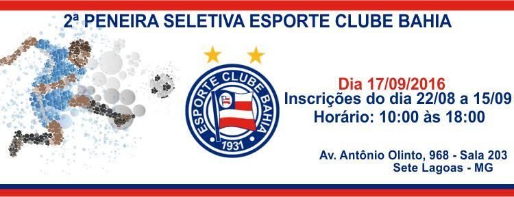 Esporte Clube Bahia busca talentos do futebol em Sete Lagoas Felipe de Jesus 8 de setembro de 2016 Cultura, Notícias 73 Seletiva será realizada no dia 17 de setembro no Campo do Bela Vista Com objetivo de revelar novos talentos do futebol, o Esporte Clube Bahia marcou a data para a seletiva de atletas em Sete Lagoas. No dia 17 de setembro, sábado, das 8h às 17h, o Campo do Bela Vista (Rua Tupiniquins, Bairro Santa Luzia, Sete Lagoas, MG) receberá atletas de toda a região que serão avaliados pela equipe técnica do clube. Para participar é necessário realizar a inscrição previamente, até o dia 15 de setembro, no escritório do 7 Fest (Av. Antônio Olinto, 968, sala 203, Centro, Sete Lagoas).Os candidatos deverão apresentar, até o dia da seletiva, os exames de eletrocardiograma e de aptidão física, com no máximo 3 meses da data de realização, e também a autorização dos pais ou responsáveis, além do pagamento da taxa de R$ 30,00. Poderão se inscrever atletas nascidos nos anos de 1998/1999, 2000/2001, 2002/2003.Os inscritos passarão por uma pré-seleção e serão escolhidos os atletas de melhor performance. Os jogadores selecionados serão levados para treinar no Centro de Treinamento da categoria de base do Esporte Clube Bahia. Esta é a segunda vez que o Esporte Clube Bahia realizada uma peneira na cidade de Sete Lagoas. Cinco atletas foram selecionadas na primeira edição e foram enviados para a categoria de base do time. Serviço: Seletiva do Esporte Clube Bahia em Sete Lagoas Data: 17 de setembro, sábado Horário: 8h às 17h Local: Campo do Bela Vista – Rua Tupiniquins, Bairro Santa Luzia, Sete Lagoas, MG Inscrições: até o dia 15 de setembro no escritório do 7 Fest – Av. Antônio Olinto, 968, sala 203, Centro, Sete Lagoas, MG) Taxa: R$ 30,00 Mais informações: (31) 3697-3002 comentários