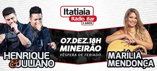 Aniversário do Itatiaia Rádio Bar apresenta Marília Mendonça e Henrique e Juliano na Esplanada do Mineirão Felipe de Jesus 18 de outubro de 2016 Cultura, Notícias 98 Festa acontece no dia 7 de dezembro, véspera de feriado O Itatiaia Rádio Bar completa três anos e promove, mais uma vez, uma grande festa para comemorar o seu aniversário. No dia 7 de dezembro, quarta-feira, véspera de feriado, a partir das 18h, a Esplanada do Mineirão (Av. Antônio Abrahão Caram, 1001, Pampulha) será palco para a dupla que arrasta multidões, Henrique e Juliano, e a cantora mais tocada nas rádios de todo o país, Marília Mendonça. Chancelado pelo Itatiaia Rádio Bar, o evento conta com a produção e realização da Nenety Eventos, empresa referência em grandes eventos em Minas Gerais. O público poderá escolher entre os espaços: Pista, Prime Open Bar, Front Stage e Camarote Premium. Henrique e Juliano Influenciados pelo sucesso da dupla João Paulo e Daniel, esses meninos, que nasceram na pequena cidade de Palmeirópolis, no Estado do Tocantins, começaram a se apresentar nas rádios do município. Ainda no primeiro período do curso de direito e no seu primeiro emprego, Henrique conseguiu através da ajuda de amigos com que os dois irmãos fizessem a abertura da festa “Balada Sertaneja”, que contou com a presença de cantores de renome nacional. Com apenas um CD acústico ao vivo gravado numa festa particular sem os recursos necessários para uma boa gravação, a dupla conseguiu um reconhecimento muito grande dos fãs. Em 2012 lançaram o segundo CD produzido pelo maestro Pinochio, álbum que se tornou um marco na carreira da dupla. Um repertório autêntico sendo que a maior parte de suas faixas são composições próprias. Henrique & Juliano começaram a aparecer com mais força ainda em 2013, quando lançaram seu primeiro DVD, de onde saíram algumas músicas que se destacaram como “Mistura louca”, “Recaídas” e principalmente “Não tô valendo nada”, que foi uma das músicas de maior destaque do último ano. Em 2014 a dupla Henrique & Juliano lança seu segundo DVD, no repertório músicas inéditas e outras já conhecidas pelo público como; Recaídas e Eu sou Gordinho. A gravação aconteceu no coração do Brasil, o estádio Mané Garrincha em Brasília foi palco de um verdadeiro espetáculo da música sertaneja, reunindo mais de 15 mil pessoas. Marília Mendonça Marília Mendonça é goiana, e tem apenas 20 anos. Ainda quando menor de idade, começou a se destacar como compositora, contribuindo com a canção “Minha Herança”, assinada por ela e pelo Frederico. Nesse mesmo período, Marília compôs também “Vai ter balanga” que também entrou no DVD gravado em 2011. Mesmo com pouca idade, Marília coleciona grandes sucessos como compositora, “É Com Ela Que Eu Estou” na voz de Cristiano Araújo, “Até você voltar” e “Cuida Bem Dela” sucesso de Henrique & Juliano. Em 2015 Marília Mendonça gravou seu primeiro DVD, com direção musical de Eduardo Pepato e vídeo Fernando Trevisan, o Catatau. A artista faz parte da WorkShow, escritório de agenciamento que possui no cast Henrique & Juliano, Zé Neto & Cristiano, Marcos & Fernando e Maiara & Maraísa. Itatiaia Rádio Bar Localizado na Rua Piumhi, no Bairro Anchieta, Região Centro-Sul de Belo Horizonte, o Itatiaia Rádio Bar faz da Rádio de Minas o primeiro veículo de comunicação do Brasil a oferecer um ambiente moderno e interativo para o convívio diário do público mineiro. Além dos melhores petiscos da cidade, o bar, com capacidade para 250 pessoas, também oferece um enorme conteúdo interativo. A música é uma das grandes atrações do bar com apresentações de Djs renomados e interações com VDjs. O espaço conta com um estúdio palco, de onde são transmitidos alguns dos principais programas da Itatiaia, além de shows, stand-ups, mesas redondas sobre os mais variados temas, programação voltada para o público feminino, cursos e degustações de vinhos, entre outros espetáculos. O Itatiaia Rádio Bar já recebeu grandes nomes para entrevistas no local, como Fernanda Vasconcellos, Mel Lisboa, Luciano Szafir, Marco Luque, Rafael Infante, Deborah Evelyn, Antônio Fagundes e muitos outros. Com o Itatiaia Rádio Bar, o torcedor mineiro também ganhou um exclusivo ponto de encontro com os amigos para acompanhar as partidas de futebol. O local oferece os dois maiores telões de led da cidade, com 4m de largura por 2,5m de altura. Além disso, outras nove televisões estão espalhadas pelo salão, não deixando ninguém perder um lance sequer. Os frequentadores assistem aos jogos pela TV, mas, claro, ouvindo a transmissão do primeiro time do rádio. Em dias de jogos, também há flashes ao vivo da programação, bolões, entrega de prêmios entre outras atrações. Serviço Itatiaia Rádio Bar comemora 3 anos com shows de Henrique e Juliano e Marília Mendonça Local: Esplanada do Mineirão – Av. Antônio Abrahão Caram, 1001, Pampulha Data e horário: 7 de dezembro (quarta-feira, véspera de feriado), a partir das 18h Valores dos ingressos: Pista: R$ 60 Prime Open Bar (vodka, cerveja, refrigerante, citrus, suco e água): Feminino R$ 140,00 | Masculino R$ 160,00 Front Stage Open Bar – (whisky, vodka, cerveja, refrigerante, citrus, suco e água): Feminino: R$ 220 | Masculino: R$ 290,00 Camarote Premium Open Bar e Open Food (whisky 8 anos, vodka premium, espumante, cerveja, refrigerante, suco e água) – Entrada pelo estacionamento G2 e acesso ao setor Front Stage: Feminino R$ 290,00 | Masculino R$ 350,00 1º lote até o dia 05 de novembro ou até o lote esgotar. *Os valores podem mudar sem aviso prévio Vendas: www.nenety.com.br Nenety eventos: Shopping 5ª Avenida ( Rua alagoas 1314 loja 16 – Savassi) Classificação etária: Pista: 14 anos Prime: 18 anos Front Stage: 18 anos Camarote Premium: 18 anos Informações: (31) 3281 2737 Realização: Itatiaia Rádio Bar Produ