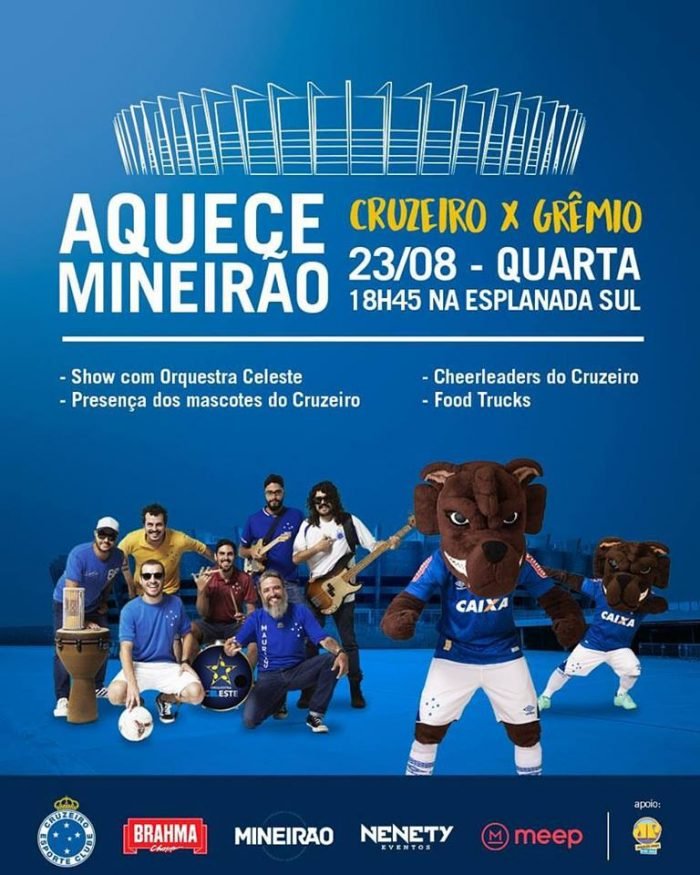 Aquece Mineirão chega para “esquentar” os torcedores antes do jogo Cruzeiro X Grêmio nesta quarta-feira Felipe de Jesus 21 de agosto de 2017 Cultura, Notícias 120 A Esplanada Sul do Mineirão receberá evento gratuito com food trucks, show com a Orquestra Celeste e presenças dos mascotes e das Cheerleaders do Cruzeiro Os torcedores contarão com uma novidade no Gigante da Pampulha. A Nenety Eventos, em parceria com o Mineirão, o time Cruzeiro, a Brahma e a Meep, realizará o Aquece Mineirão, evento com entrada franca que tem como objetivo ser um ponto de encontro para a família para saborear comidas e bebidas, além de curtir shows musicais antes e após os jogos. A primeira acontece na próxima quarta-feira, dia 23 de agosto, às 18h45, na Esplanada Sul do Mineirão, antes do jogo em que o Cruzeiro enfrentará o Grêmio pela Copa do Brasil. Antes do jogo, a Orquestra Celeste, os mascotes e as Cheerleaders do Cruzeiro colorirão de azul a Esplanada Sul do Mineirão em um evento direcionado para toda a família. Para acompanhar a animação, food trucks com comidas deliciosas além, é claro, de muita cerveja gelada. A entrada para o Aquece Mineirão é gratuita e o evento é aberto tanto para os torcedores que forem assistir ao jogo dentro do estádio, tanto para quem quiser confraternizar com a torcida, mas não necessariamente vá acompanhar a partida da arquibancada. Serviço Aquece Mineirão 23 de agosto, quarta-feira, 18h45 Atrações: show com a Orquestra Celeste e presenças dos mascotes e das Cheerleaders do Cruzeiro, além de food trucks Entrada franca Classificação etária: livre Realização: Nenety Eventos, Mineirão, Cruzeiro, Brahma e Meep comentários